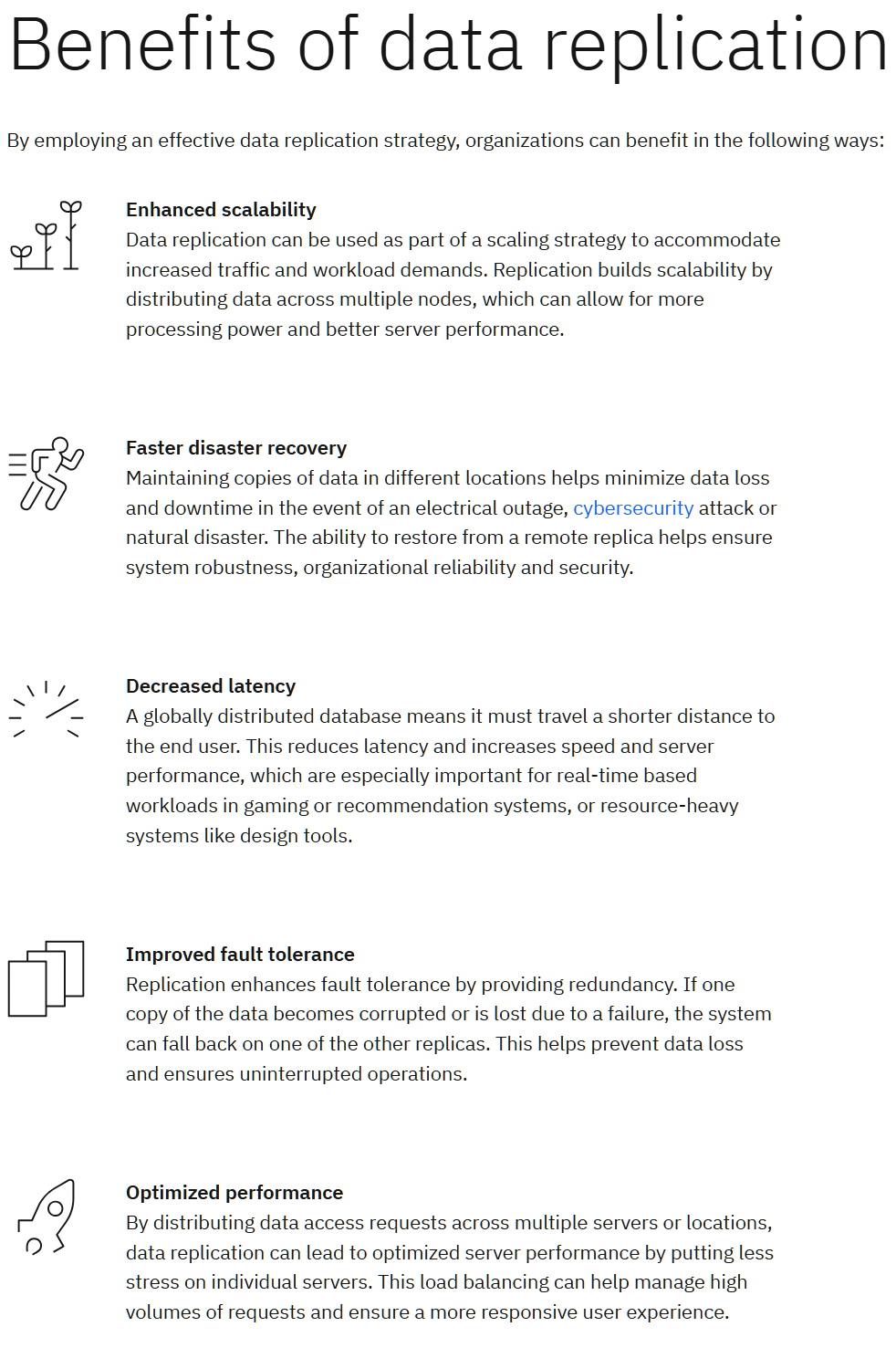 将驻留在物理/虚拟服务器或云实例(主实例)上的数据连续复制或拷贝到辅助服务器或云实例(备用实例)的过程。复制的数据支持高可用性、备份和/或灾难恢复。